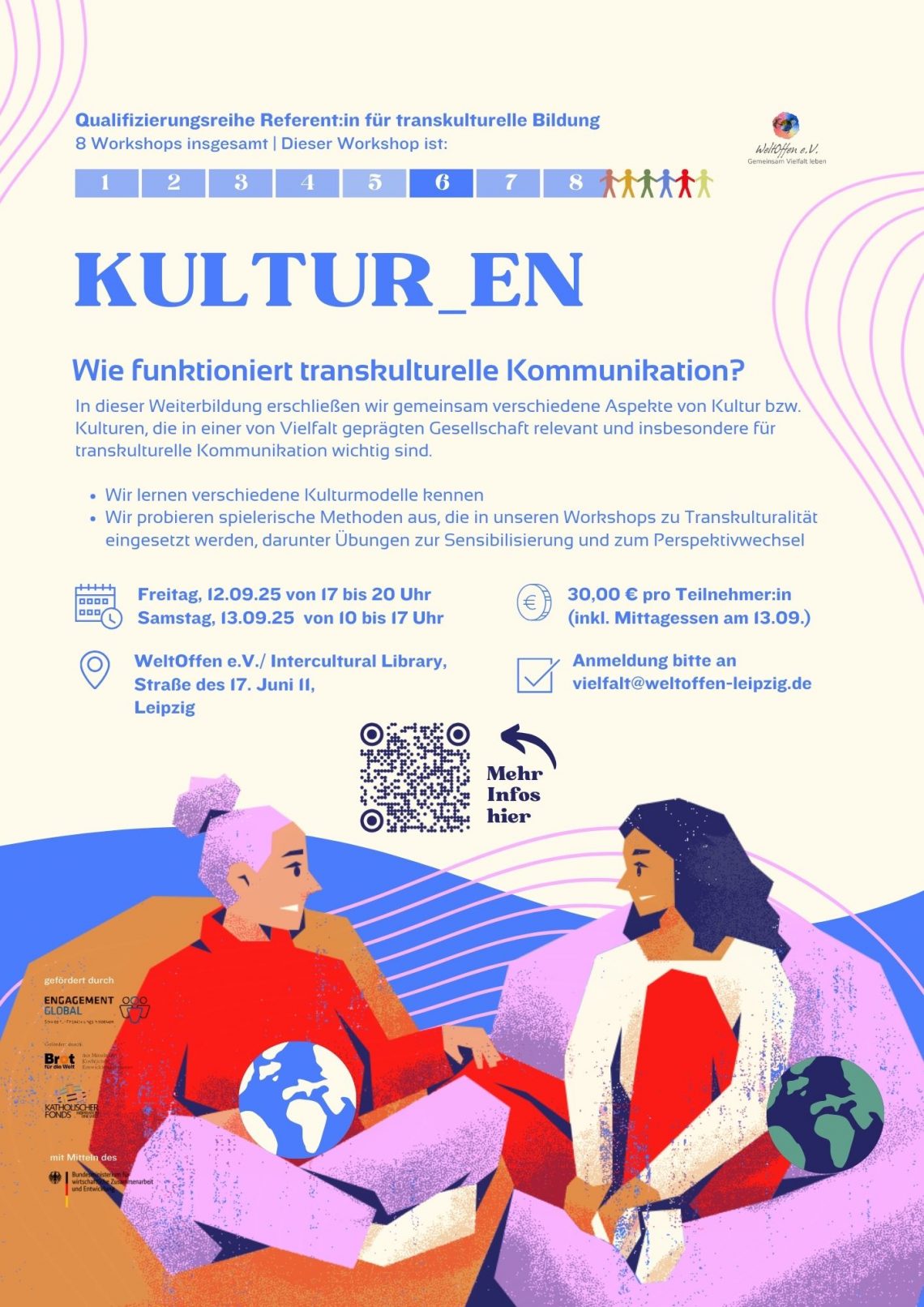 In dieser Weiterbildung erschließen wir gemeinsam verschiedene Aspekte von Kultur bzw. Kulturen, die in einer von Vielfalt geprägten Gesellschaft relevant und insbesondere für transkulturelle Kommunikation wichtig sind. Wir lernen verschiedene Kulturmodelle kennen und probieren spielerische Methoden aus, die in unseren Workshops zu Transkulturalität eingesetzt werden. Auch für erwachsene Zielgruppen geht es dabei oft um Übungen zur Sensibilisierung und zum Perspektivwechsel.